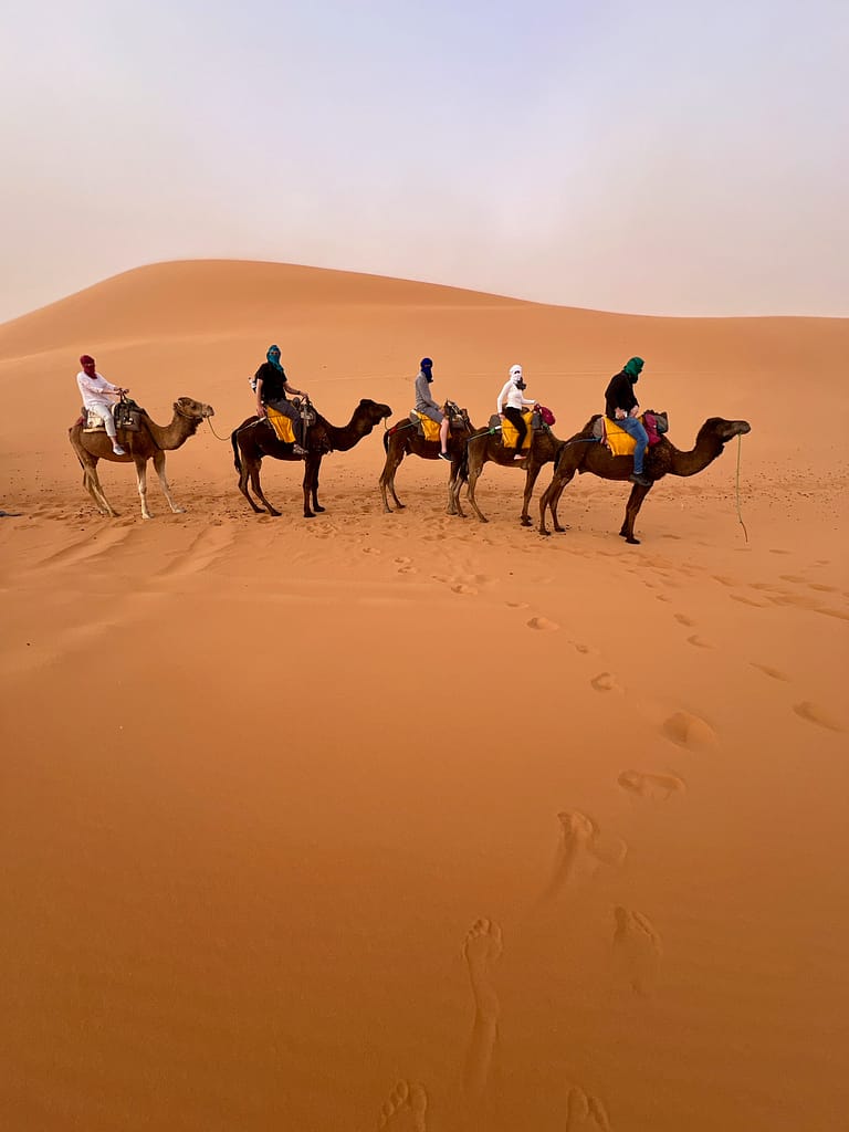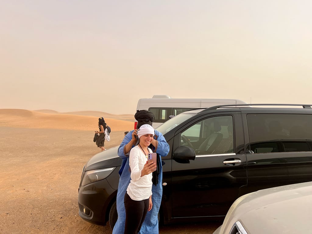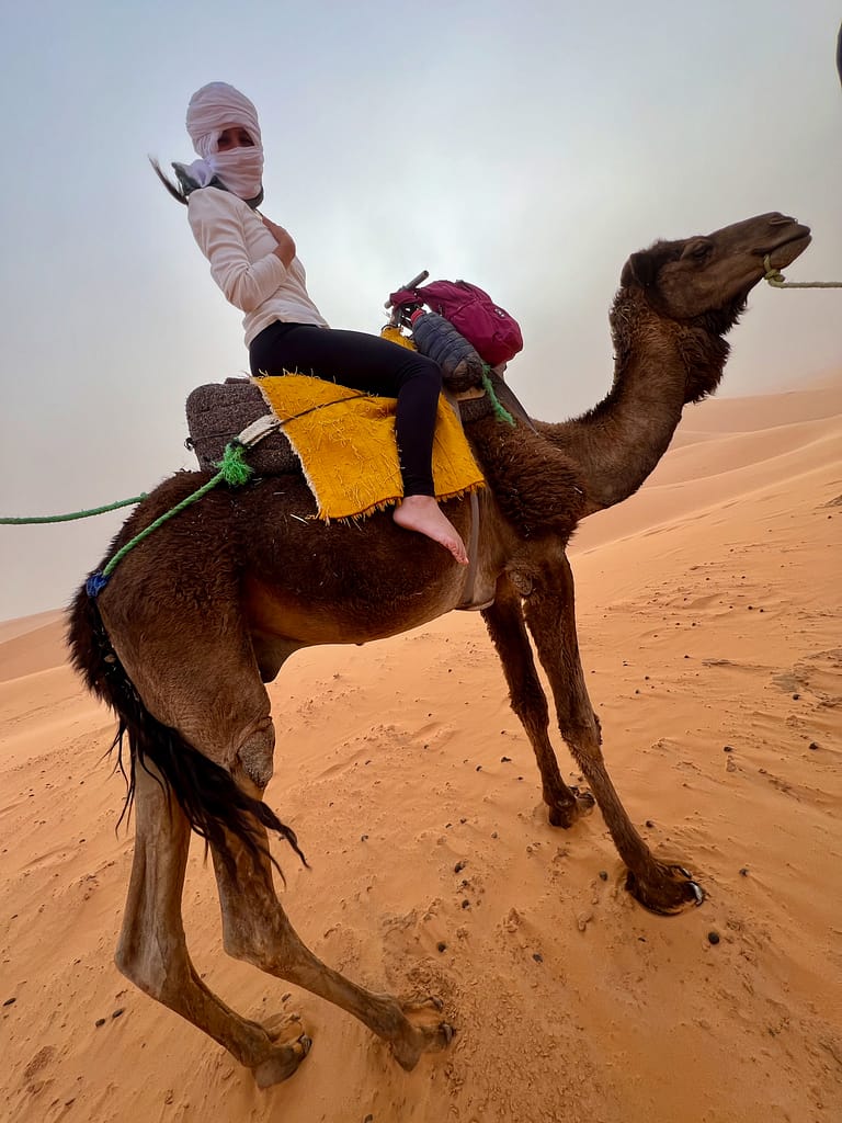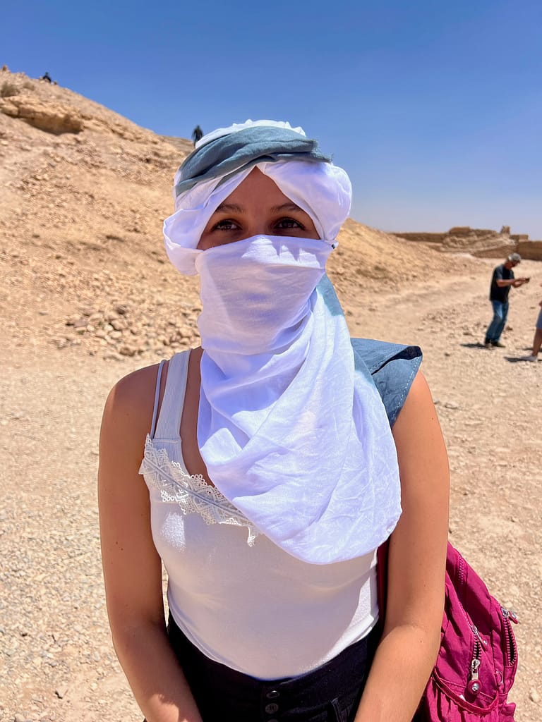 Nach der Fahrt nach Mezouga, beginnt der Wüstenaufenthalt mit dem Kamelritt zum Camp. Da ein leichter Sandsturm herrschte, mussten erstmal Turbane gebunden werden.